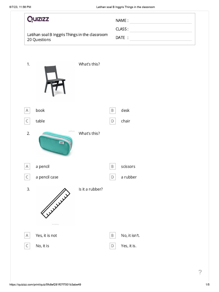 - Kosa Kata: Book, Pencil, Pen, Bag, Table, Chair, Board, Door, Window, Eraser.
