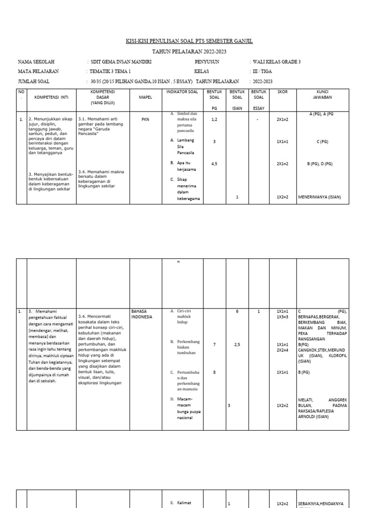 Artikel ini akan menyajikan panduan mendalam mengenai kisi-kisi soal tematik tema 1 kelas 3, dengan fokus pada bagaimana kisi-kisi ini dapat menjadi instrumen strategis untuk memastikan pemahaman yang komprehensif dan persiapan yang matang bagi siswa. Kita akan mengupas tuntas berbagai aspek, mulai dari tujuan pembuatan kisi-kisi, komponen-komponennya, hingga contoh aplikasinya dalam menyusun soal yang efektif.